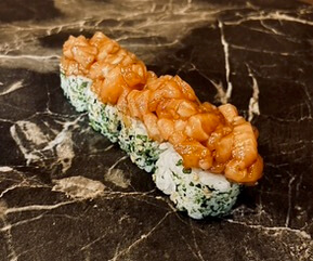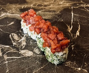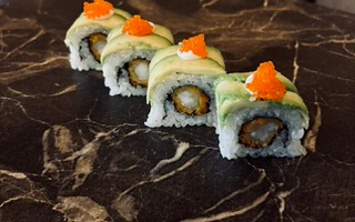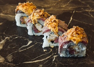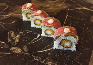 Rivierkreeft, avocado, tonijn, Nori's mayonaise, teriyaki en wasabi kruiden